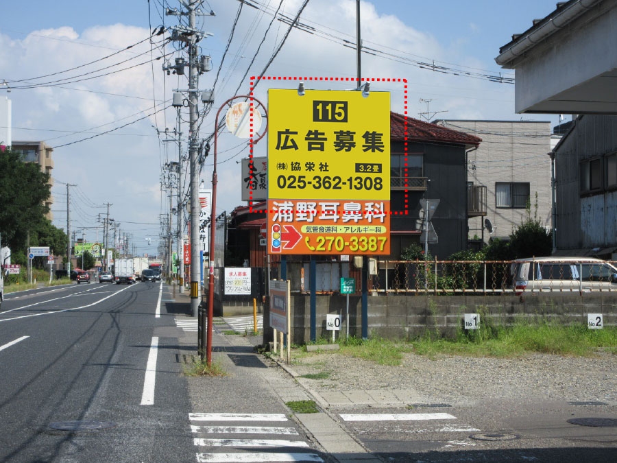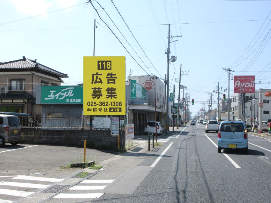 近隣には、イオン新潟東店をはじめとする商業施設も多く、注目度の高い野立て看板となります。