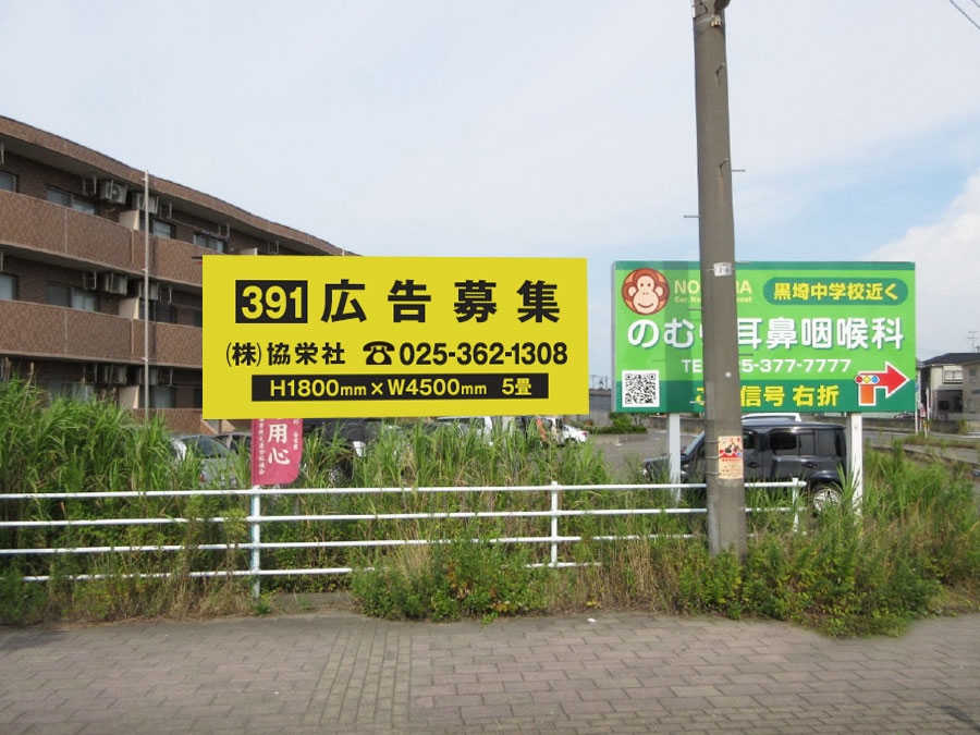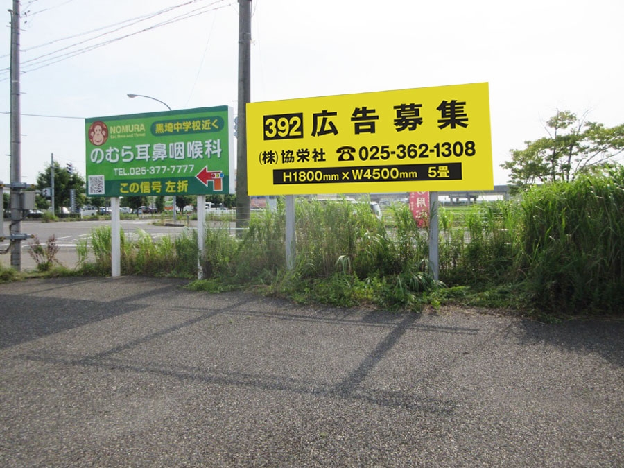 国道17号線から新通方面に向かい右手側で、注目度の高い野立て看板となります。