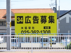 越後線 電車内からも目立つ位置で、小針駅利用者も多いため、注目度の高い野立て看板となります。