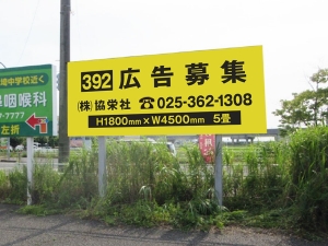 国道17号線から新通方面に向かい右手側で、注目度の高い野立て看板となります。